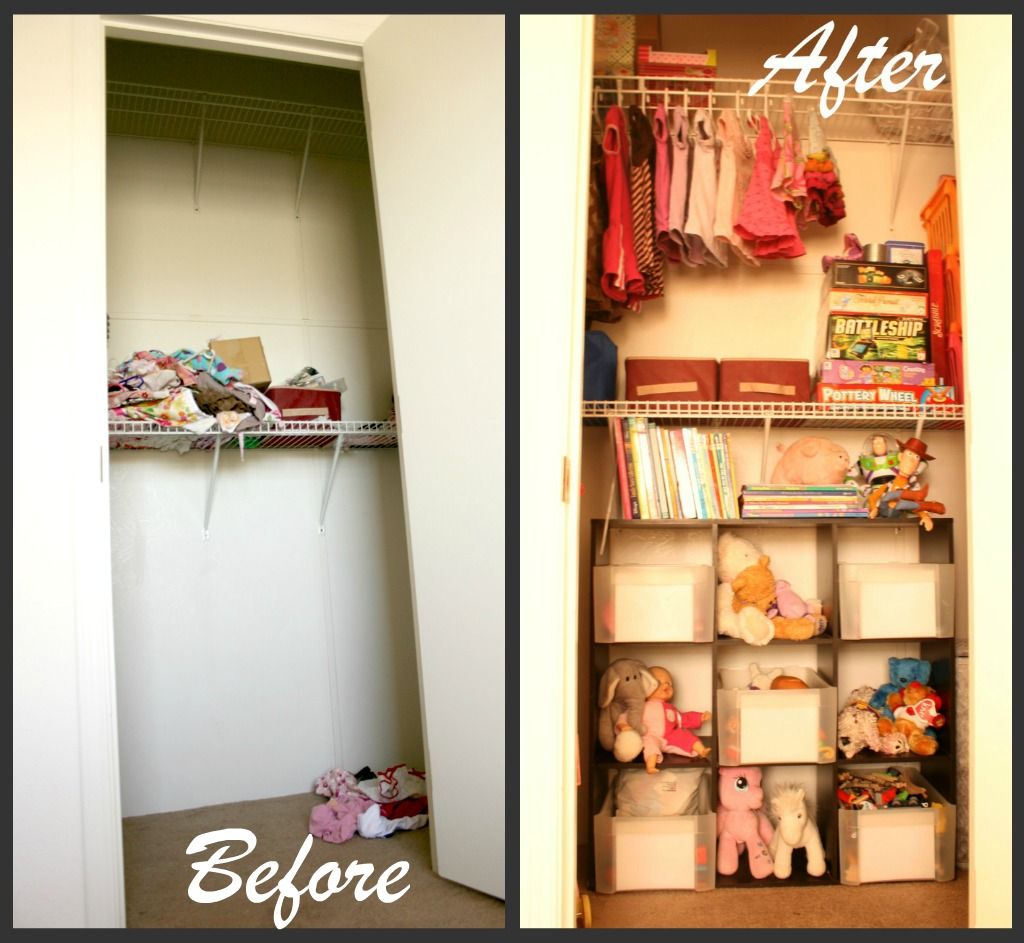 1. The top shelf was lowered so that I can now hang clothes on. They are low enough for me to reach but allow me to keep clothes out of the kids reach